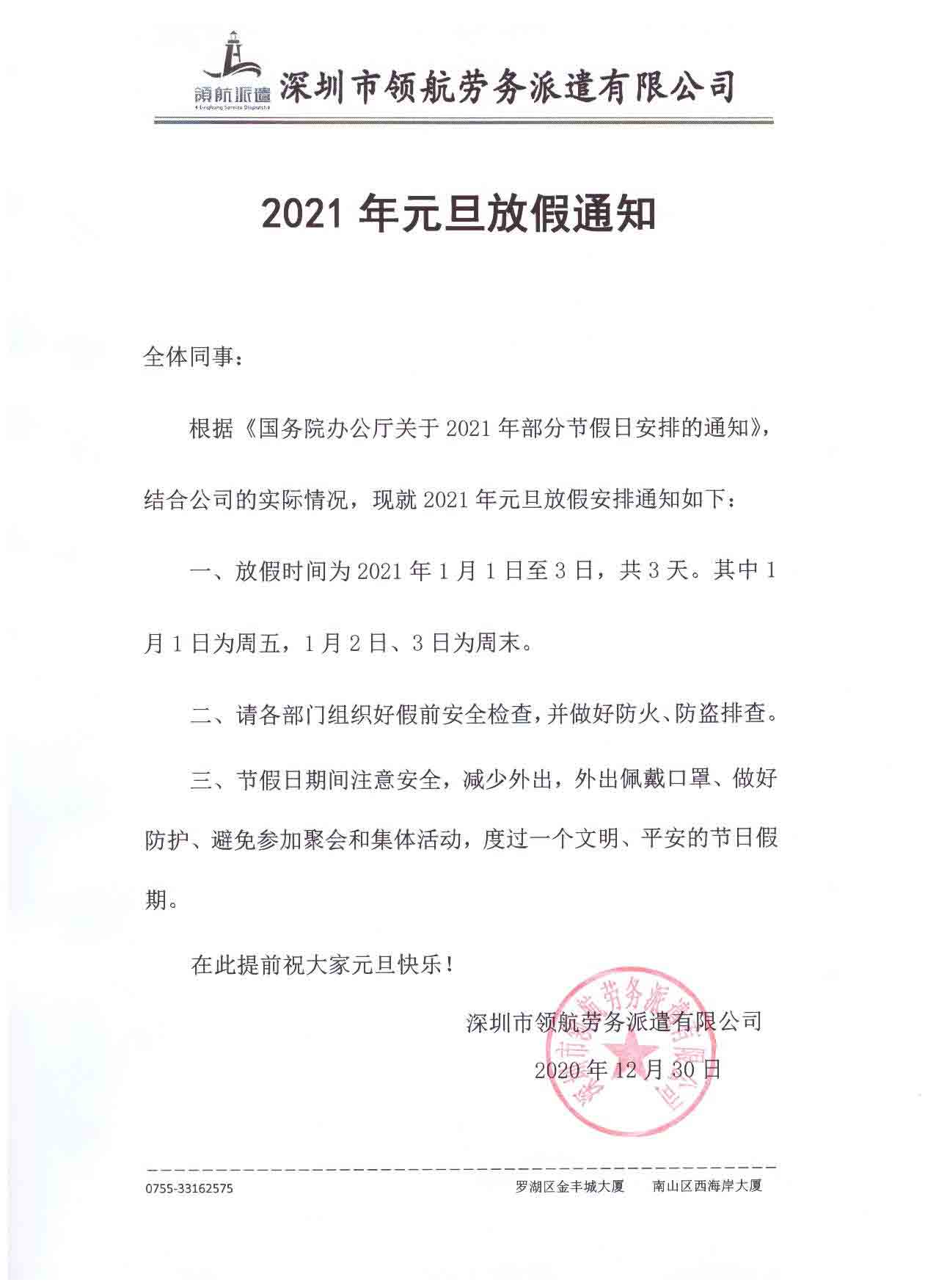 2021年元旦放假通知